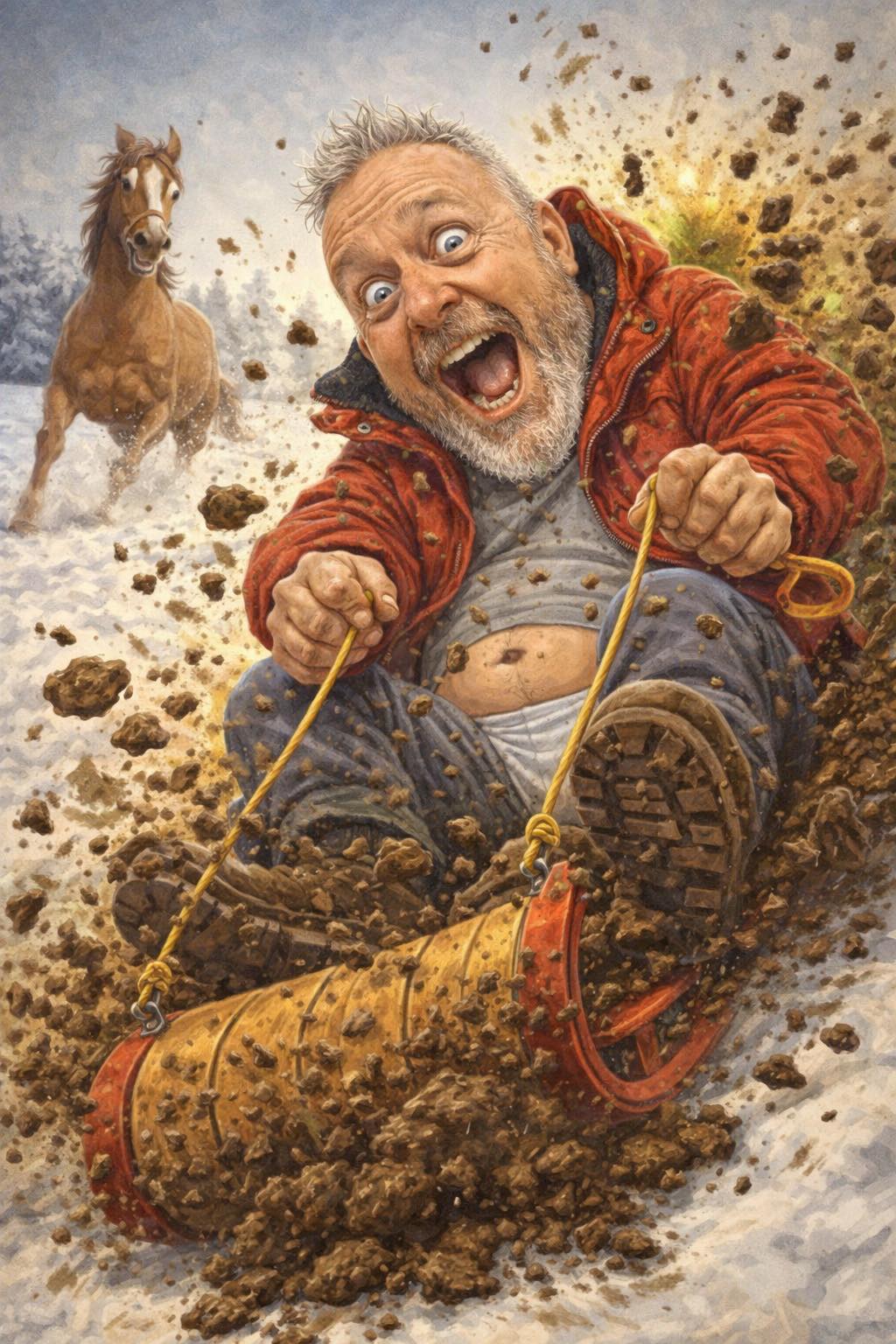 Boots, clothing, sled pieces, and dignity are flying thirty to forty feet in the air.
