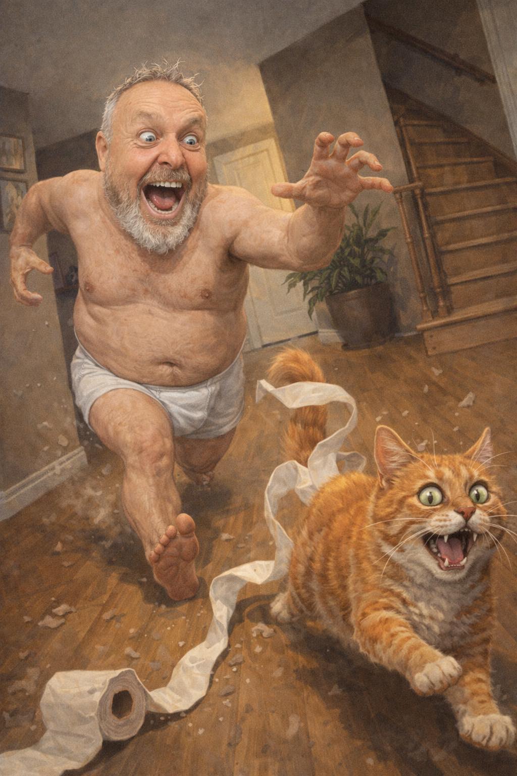 So I hit the hallway at about a hundred and three miles an hour wearing nothing but my underwear.