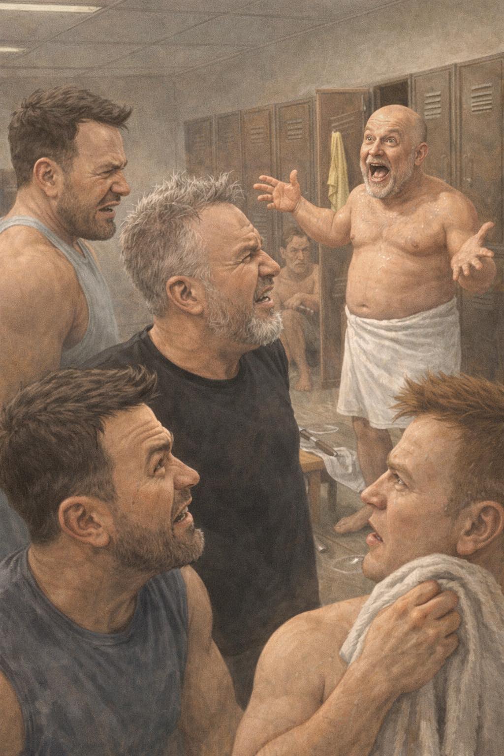 Then he shuts the water off and starts his slow parade across the locker room, still talking.