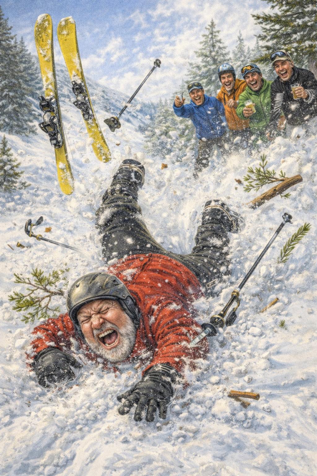 Took out seven spruce trees, two frozen hay bales, and ended up in a damn tree with no boot, my pants down, and my ski jammed up my ass.